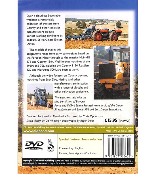 Deel op Facebook Deel op Twitter Deel op LinkedInCounty Tractor Working Days with Ford Conversions De video richt zich voornamelijk op de County tractoren, de machine's van Bray, Doe, Mathbro en andere fabrikanten in actie met een aantal ploegen en andere teeltapparatuur. Ook de vroege conversies op vasis van de Fordson Major, de massale Muir Hill 171, en bekende machine's uit de jaren 1960 en 1970 met inbegrip van de Provincie zijn te zien.